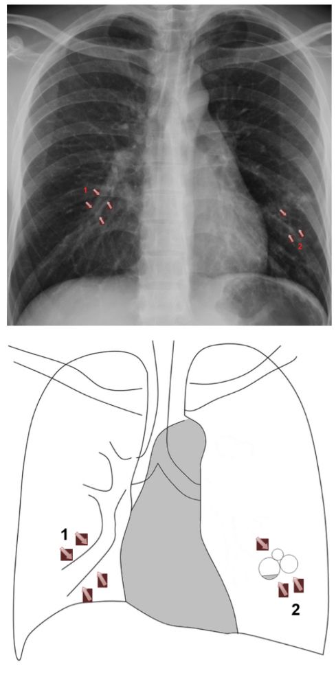 小時候曾因肺炎住院數次。此次理學檢查肺部有囉音,咳嗽後會消失;胸部X光片顯示