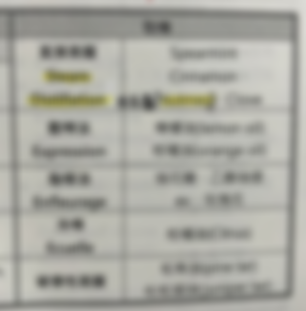 | 壓榨 (Expression) | Lemon oil, orange oil 想成榨果汁...? |