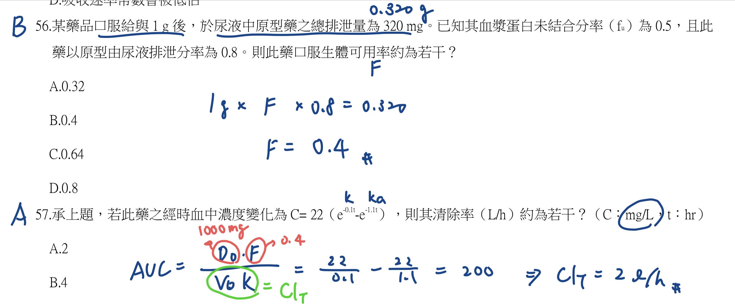 57.承上題,若此藥之經時血中濃度變化為C=22