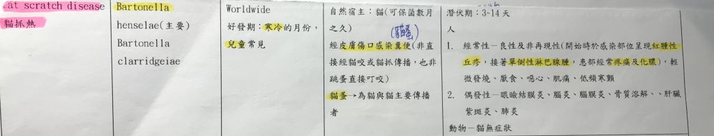 Bartonella henselae,貓抓病,經由傷口感染(貓抓咬),貓本身為保毒動物,不發病。