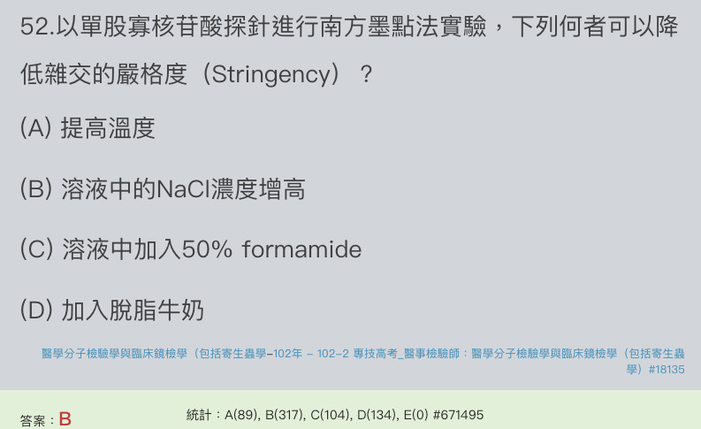 57.進行雜交試驗(hybridization)時,下列何種條件最能容許探針與待測序列之鹼基配對錯誤的存在?