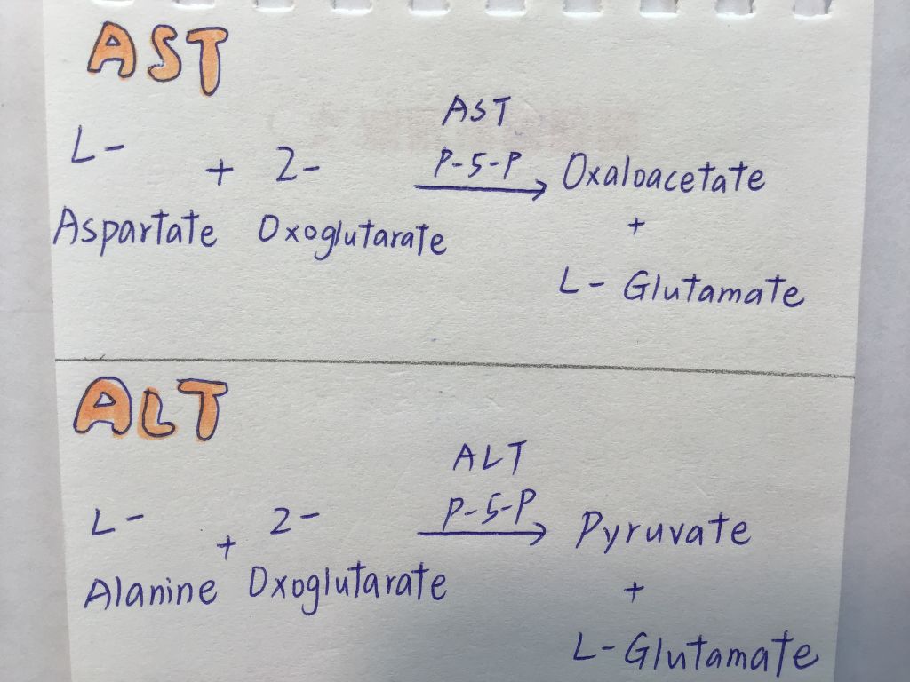 57.AST及ALT轉胺酶反應,各將不同的胺基酸上的胺基,轉到那一種胺基接受者上?