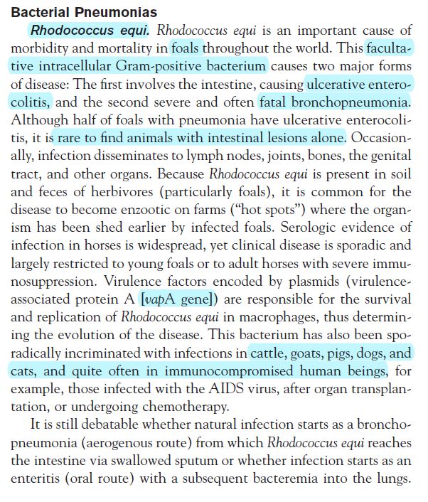 Rhodococcus equi 多引發化膿性支氣管性肺炎以及化膿性肉芽腫性潰瘍性盲腸結腸炎