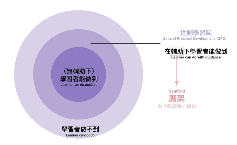 (A)鷹架理論,學生透過老師所提供的架構或方向,一步步完成一個複雜的任務