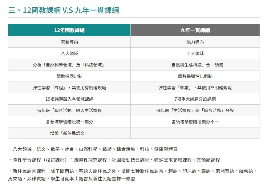 十二年國民基本教育課程依據全人教育之理念,配合知識結構與屬性、社會變遷與知識創新及學習心理之連續發展原