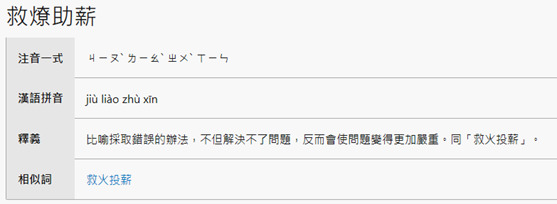 (A)救燎助薪ㄐㄧㄡˋ ㄌㄧㄠˋ ㄓㄨˋ ㄒㄧㄣ比喻採取錯誤的辦法,不但解決不了問題,反而會使問題變得更加嚴重。同「救火投薪」。