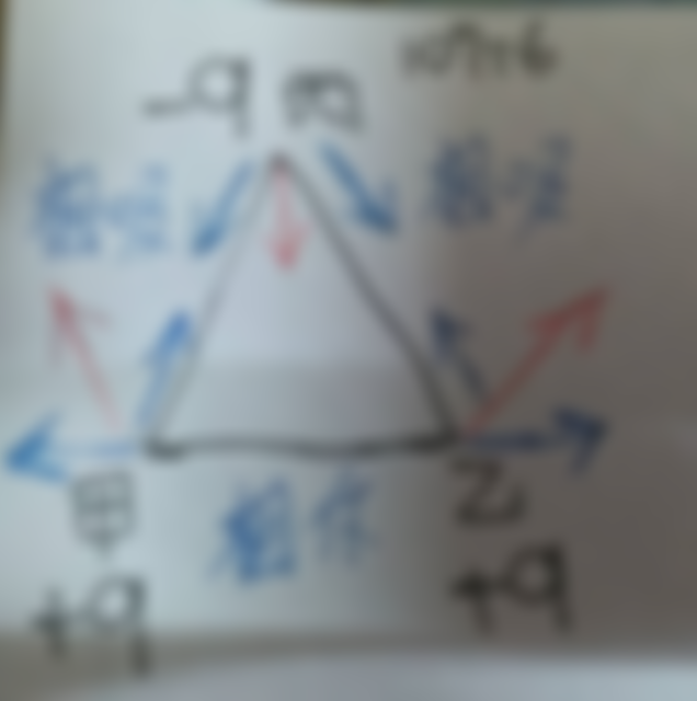 6 甲、乙、丙三個點電荷位於正三角形的三個頂點上,所帶的電荷分別為 q、q、-q。若以箭頭代表甲、 乙、丙受到的靜電力方向,則下列何圖正確?