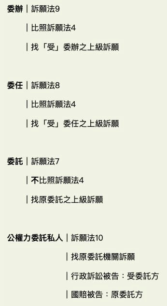 (4)委託行使公權力 (行政委託) | 管轄權發生移轉於受託之私人,受託人以自己名義作成行政處分 | 為不相隸屬之行政主體與私人間的關係(係行政組織對外的權限移轉) | 若為行政處分,以受託人自己名義對外作成行政處分。 | 向原委託機關提起訴願 |