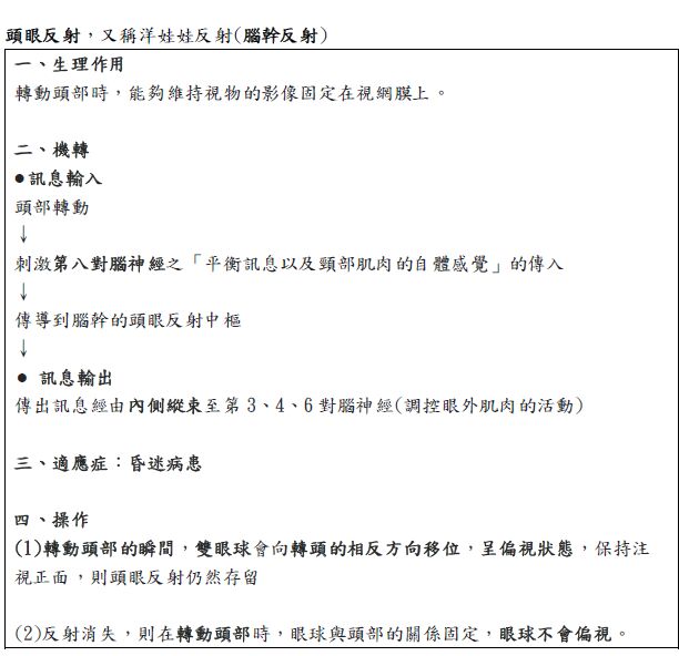 頭眼反射(doll's eye reflex)腦幹反射,與脊髓反射無關。患者在頭部轉動時,若眼球保持穩定凝視(即眼睛的視線在頭部轉動的相反方向上保持固定),這是一種正常的頭眼反射,反映腦幹特定部位的功能完整,尤其是與眼球運動有關的腦幹神經核和前庭系統功能正常。當腦幹功能受損,特別是昏迷患者,頭眼反射可能會減弱或消失。如果在轉動患者頭部時眼球無法保持穩定凝視,跟隨頭部的方向轉動,則顯示腦幹功能可能受損。