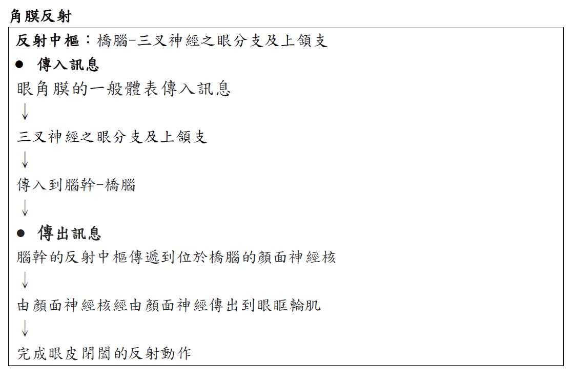 由三叉神經和面神經控制,屬於腦神經反射,主要用來檢查腦幹的健康狀況。