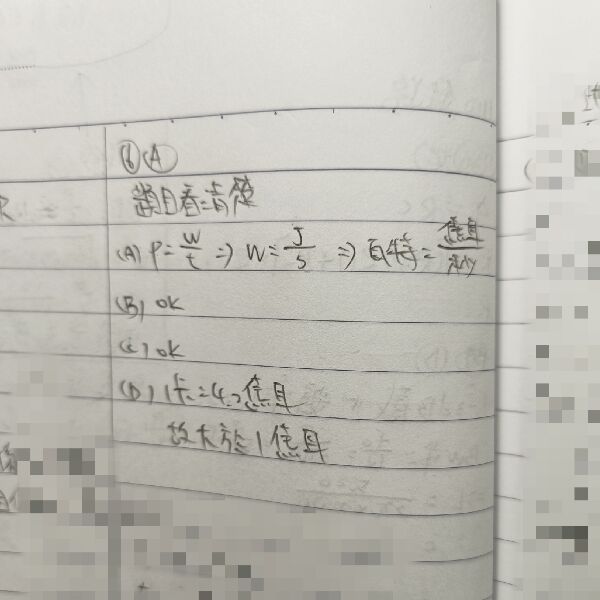 (A) 1 瓦特等於 1 焦耳乘以 1 秒