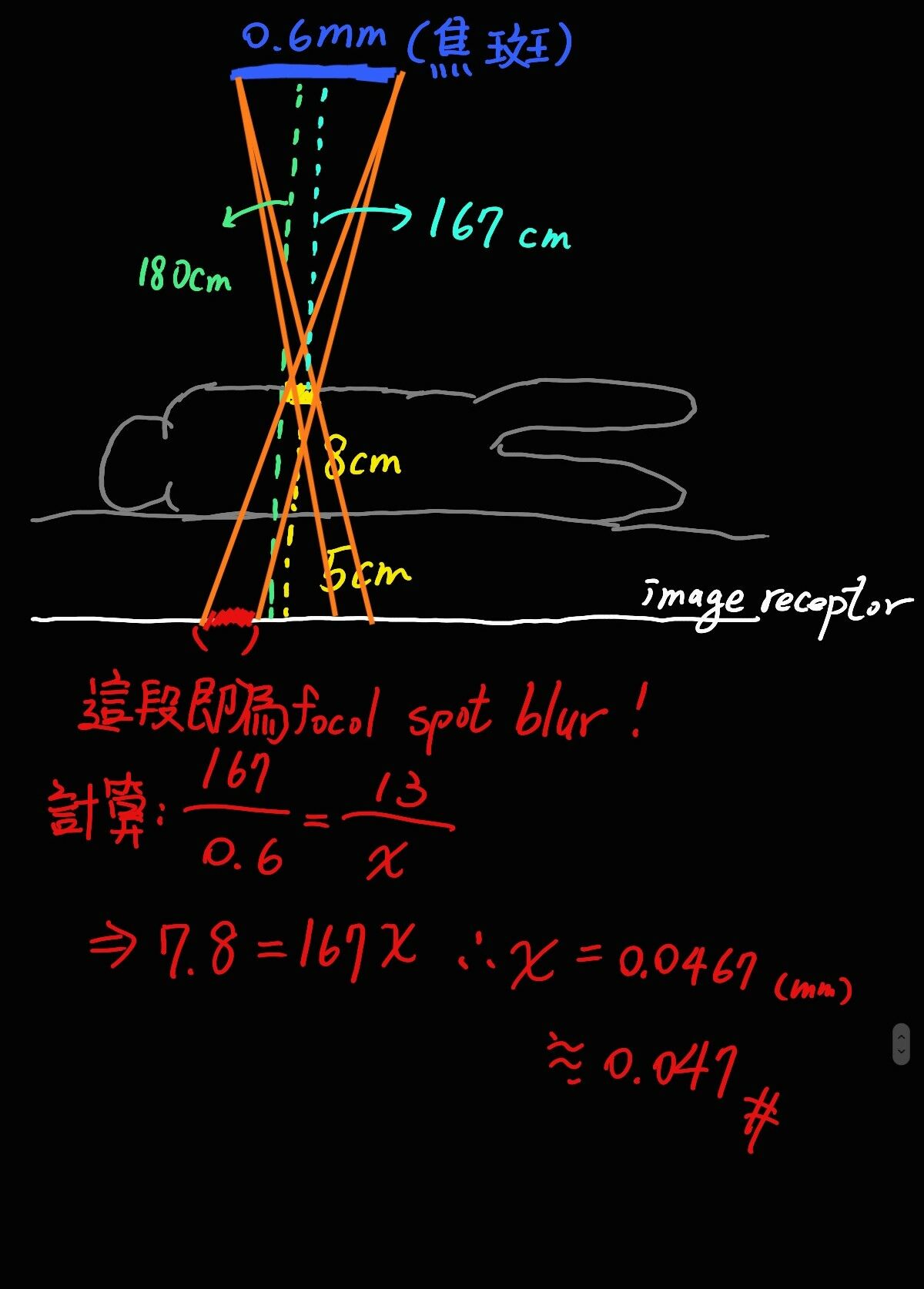6.一病患在距離前側胸壁8 cm處有一鈣化病灶,如利用一有效焦斑為0.6 mm的X光機進行胸腔X光攝影(PA