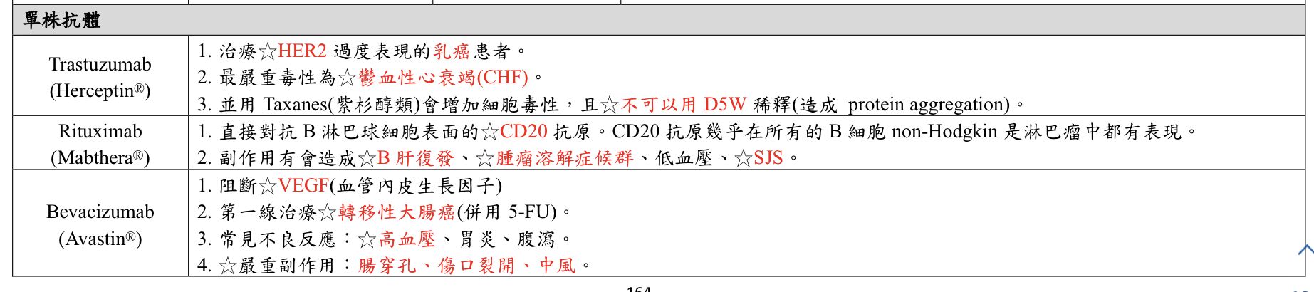 Jason Chen 國三下 (2015/03/12 16:22):11人 (A)Alemtuzumab(Campath®): ㊉B-&T-lymphocyte之CD52→治B-cell慢性淋巴性白血病(CLL),副作用:貪血、血小板減少症、伺機性感染。 (B)Bevacizumab(Avastin®) :㊉vascular endothelial growth factor(VEGF)→轉移型結腸大腸癌的第一線用藥,副作用: Gastrointestinal perforation胃腸穿孔、高血壓、動脈栓塞、蛋白尿。 (C)Cetuximab(Erbitux®) :㊉epidermal growth factor receptor(EFGR)→治轉移型結腸大腸癌,副作用:粉刺型皮疹、過敏反應。 (D)Gemtuzumab(Mylotarg®):㊉leukenmic blast cell之CD33→治急性骨髓性白血病(AML),副作用:骨髓抑制、肝毒、過敏反應。 | ||
