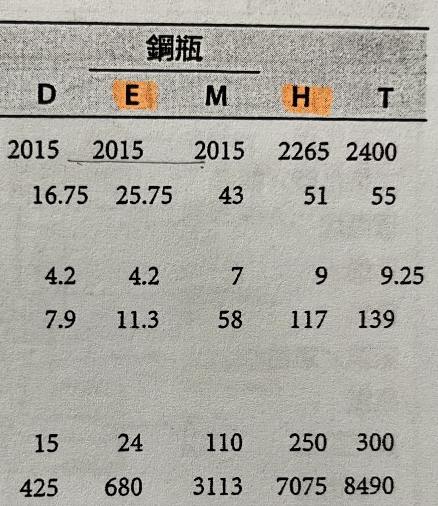 圖為各類鋼瓶不同之灌裝壓力(paig),其中以H鋼瓶2265 psig灌裝容積為最多。