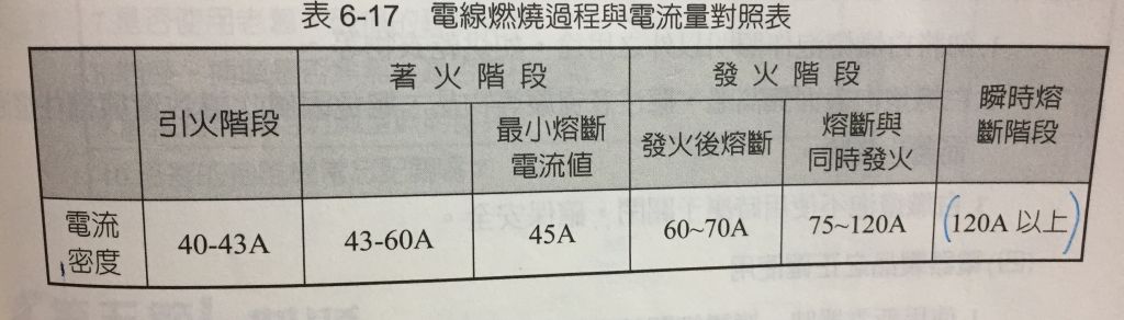 6.電線燃燒過程中,其著火階段最小熔斷電流值之電流密度為多少(A)?