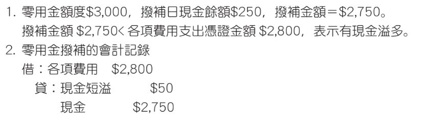 證總和為$2,800,則有關零用金撥補的會計記錄何者正確?