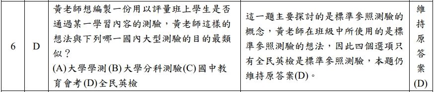 6. 黃老師想編製一份用以評量班上學生是否通過某一學習內容的測驗,黃老師這樣的想法與