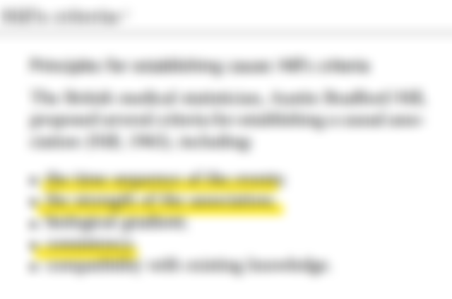 第九,特異性(Specificity),即一個果只有一個因。但這個準則也許是9個準則中最弱的,因為生物學及醫學上的複雜性,一個果往往都可以又不同的原因促成,例如肝癌可以是由B型肝炎病毒、C型肝炎病毒、喝酒,甚至是發霉的花生所引起的。