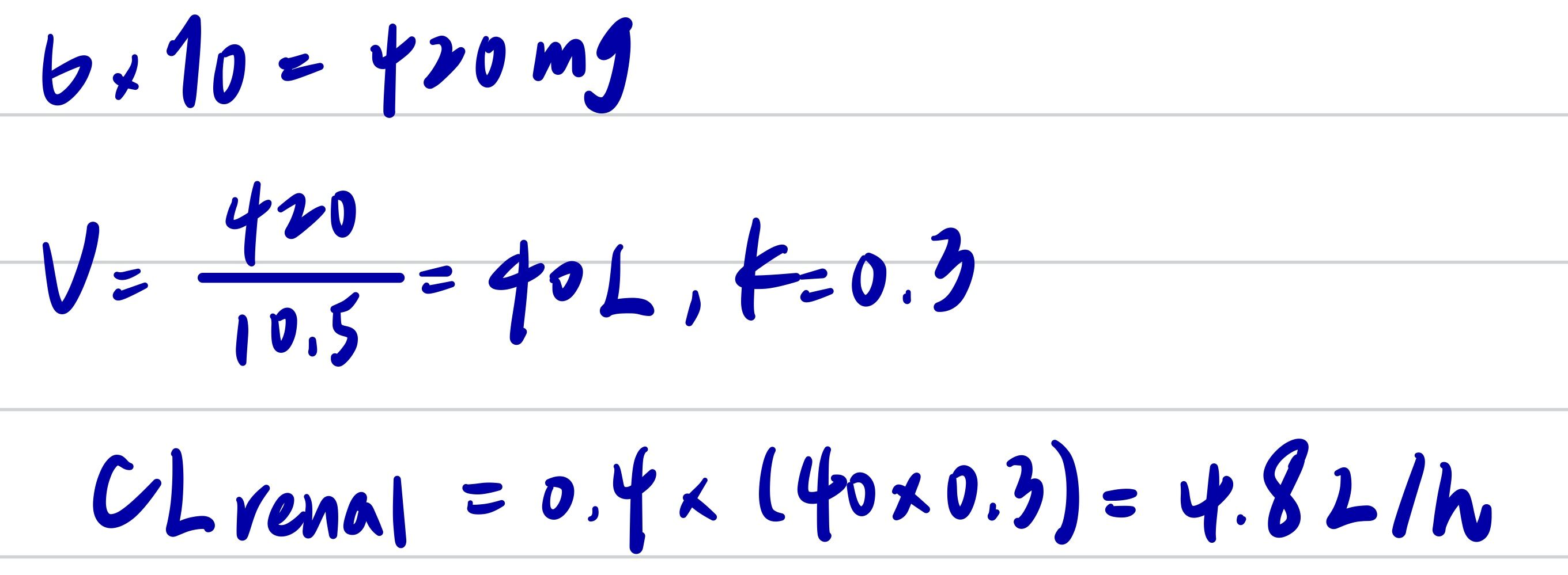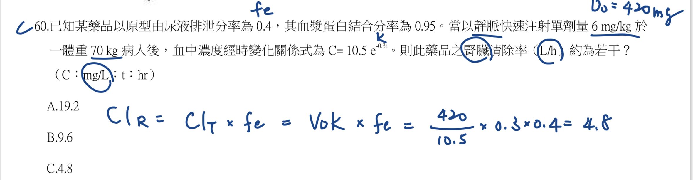 60.已知某藥品以原型由尿液排泄分率為0.4,其血漿蛋白結合分率為 0.95。當以靜脈快速注射單劑量6 mg/kg 於一體重 70 kg 病人後,血中濃度經時變化關係式為 C=