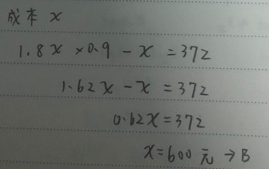 售價,結果獲利 372 元。請問這條牛仔褲的成本是多少元?