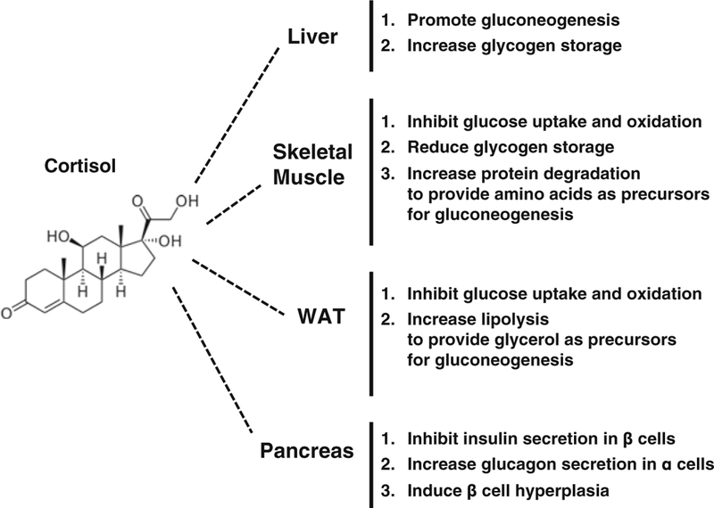 In liver, glucocorticoids increase glycogen storage, whereas in skeletal muscle they play a permissive role for catecholamine-induced glycogenolysis and/or inhibit insulin-stimulated glycogen synthesis.