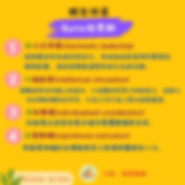 1.魅力/理想化的影響(charima/idealized influence):領導者 具有使命感及遠景,獲得部屬的信賴與尊敬,而願意付出心力。 →(A)