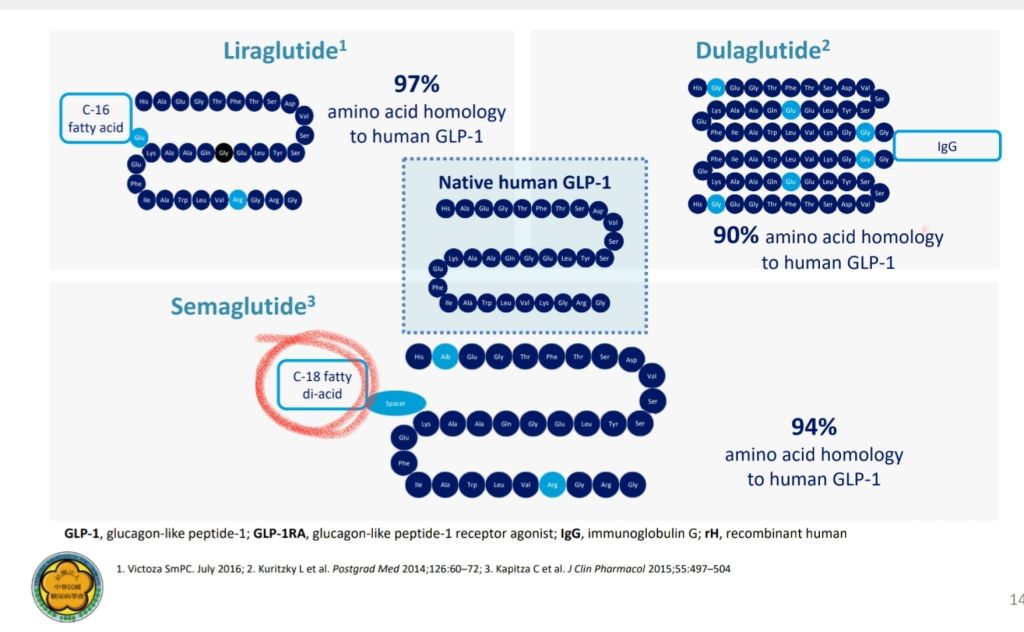 2. liraglutide:有加上C16 fatty acid,t1/2 = 13 hrs,可QD。