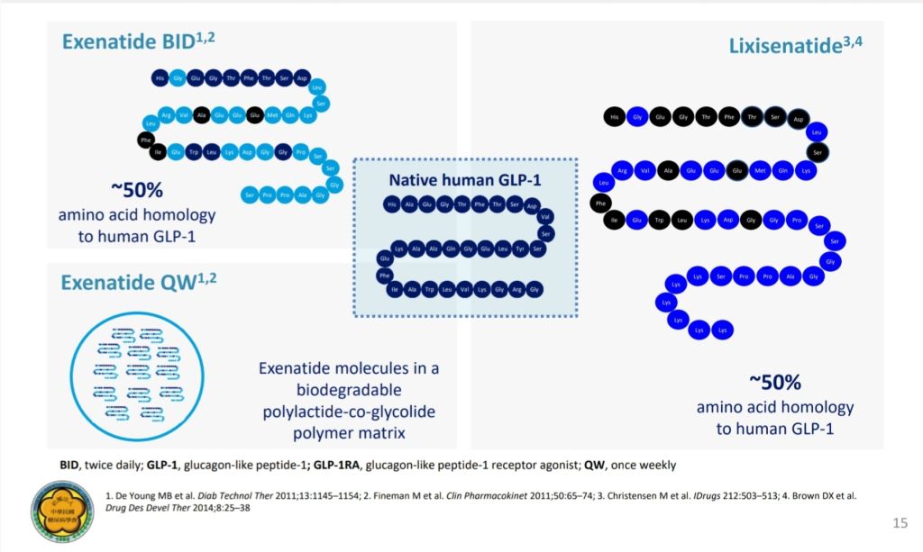 1. exenatide:將ala-glu這個DPP-4辨識位改變成gly-gly,但效用還是最短 (t1/2 = 3 hrs)。