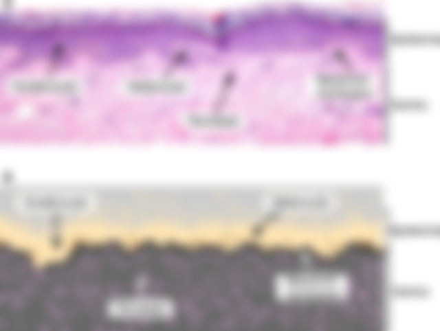 64.下圖所示牙齦組織切片(HE染色)中,箭頭所指之細胞,下列何者正確? (A)Keratinocytes in basal layer (B)Fibroblasts (C)Keratinocytes in granular layer (D)Endothelial cells
