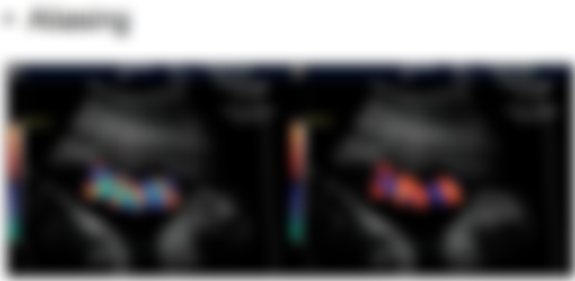 64.下圖為頸動脈之彩色都卜勒超音波,箭號所指可能為何? (A)正常且適當之參數設定 (B)彩色都卜勒之aliasing假影 (C)彩色都卜勒之side lobe假影 (D)彩色都卜勒之clutter假影