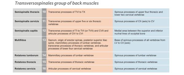 Deep layer:橫突棘肌群transversospinales muscles group,皆為短肌,由脊椎的橫突斜向內上方連接到上段脊椎的棘突及椎板laminae,又可分為三群,由淺至深:半棘肌semispinalis,多裂肌multifidus 及 旋轉肌rotatores。