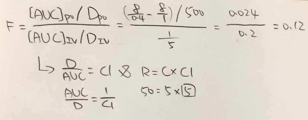 生體可用率=(AUCPO/D0,PO )/(AUCIF/D0,IF )=(12/500)/2=0.012=12%