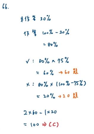 66. 某份測驗共有 100 題,每題答對得 2 分,答錯則倒扣 1 分,未作答則不得分也不扣分。強強有 20%的題目未作答,且 作答的題目中答對佔了 75%,請問強強這個測驗得到多少分?