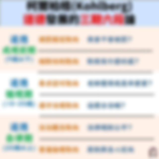 道德成規前期(前習俗)1.服從與懲罰定向(避罰服從)2.利己主義定向(相對功利)(「對我有何益處?」) 道德成規期(習俗)3.人際和諧與一致(尋求認可)(好孩子定向)4.維護權威與社會秩序定向(社會法制)(法律與秩序定向) 道德成規後期(後習俗)5.社會契約定向6.普遍倫理原則(原則與良心定向) 資料出處 : https://zh.wikipedia.org/zh-tw/%E6%9F%AF%E5%B0%94%E4%BC%AF%E6%A0%BC%E9%81%93%E5%BE%B7%E5%8F%91%E5%B1%95%E9%98%B6%E6%AE%B5