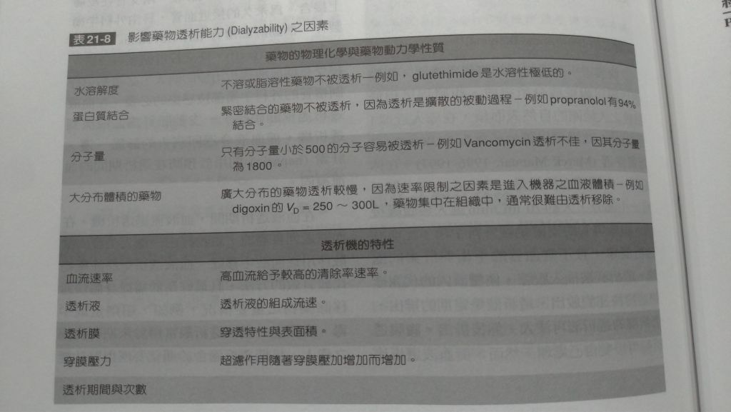 69 在血液透析(hemodialysis)的過程中,具下列何項特性的藥物較不易被透析移除?