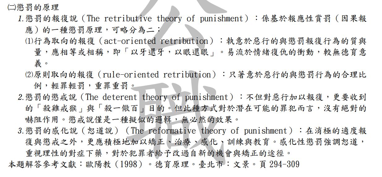 | (C) 懲戒說 | 維持紀律、威嚇作用,促使守規 | ✅ 為了維護秩序即使懲罰無辜也可接受 | ✅ 正確 |