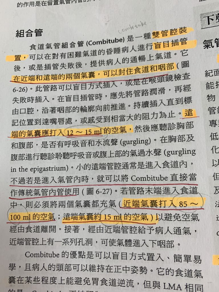 69.Combitube的咽部和食道兩處的氣囊(cuff)在充氣時應各打多少mL的空氣?