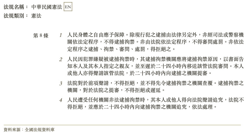 7 依司法院釋字第 443 號解釋,憲法第 8 條有關「人民身體之自由應予保障,非由法院依法定程序,不