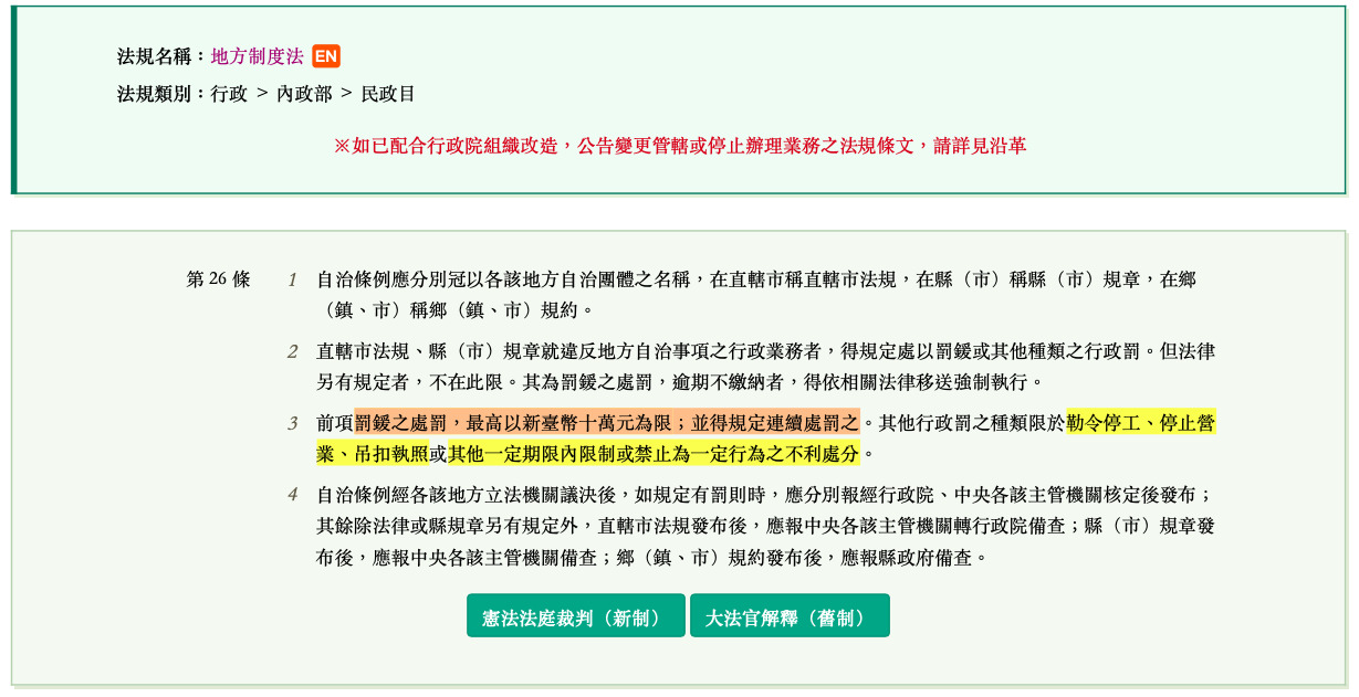 自治條例經各該地方立法機關議決後,如規定有罰則時,