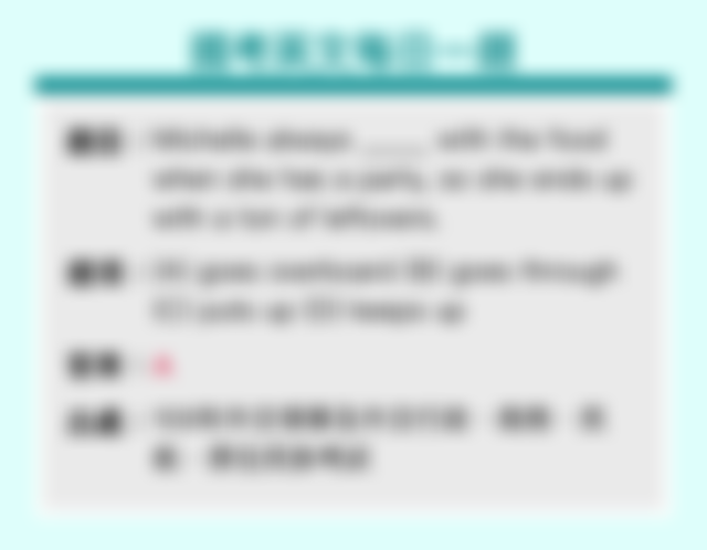蜜雪兒開派對時總是把食物吃得過飽,所以她最後剩了很多剩菜。 (A)過多 (B)經過 (C)架起 (D)跟上
