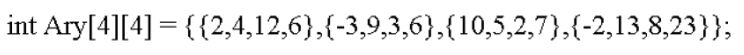 7. 在 C 語言中,如果作下列宣告,則 Ary[3][2]之值為何?