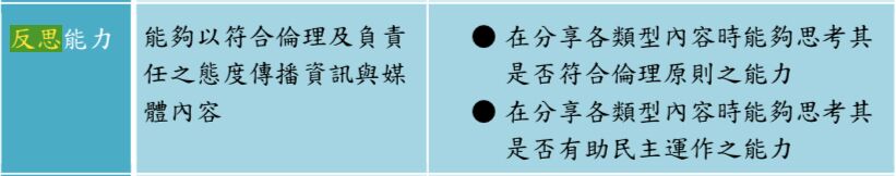 7. 將社會責任及倫理原則運用於自我認同與溝通行為之能力,藉以對自己之媒體生活有所認識並進行管理,這是屬於媒體素養教育能力