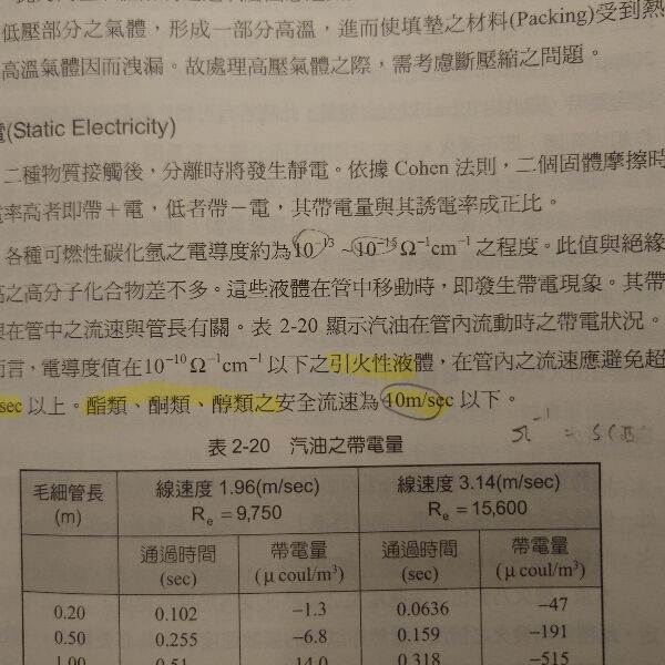 酯類、酮類、醇類之安全流速為10 m /...