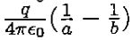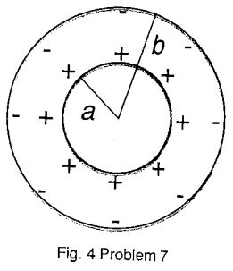 7. A conducting sphere of radius a has a charge q. It is enclosed by a conducting shell of radius b with a charge −q as shown in Fig. 4. What is the potential difference V = φ(a) − φ(b)?