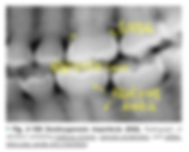 中胚層障礙,外胚層正常。萌發時外型正常,但牙釉質容易一片片剝落,且暴露牙本質快速attrition;pulp chamber & root canals obliteration(堵塞),bulbous crowns, cervical constriction, thin roots.