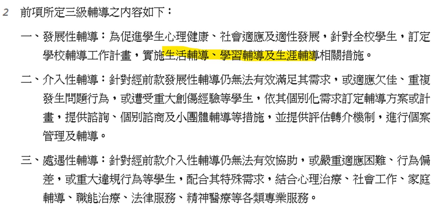 70. 有關學校輔導工作內涵,除了輔導行政工作以外,主 要包含三大分類,下列敘述何者正確?