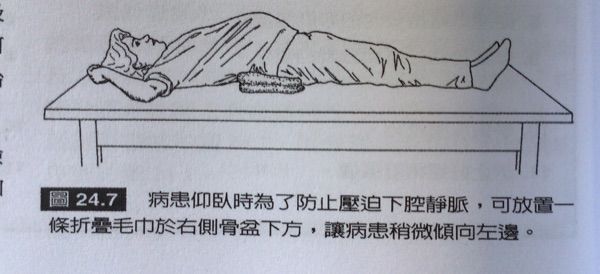 71.有關懷孕後期,給予孕婦之仰躺姿勢建議,下列何者為最佳安全姿勢?