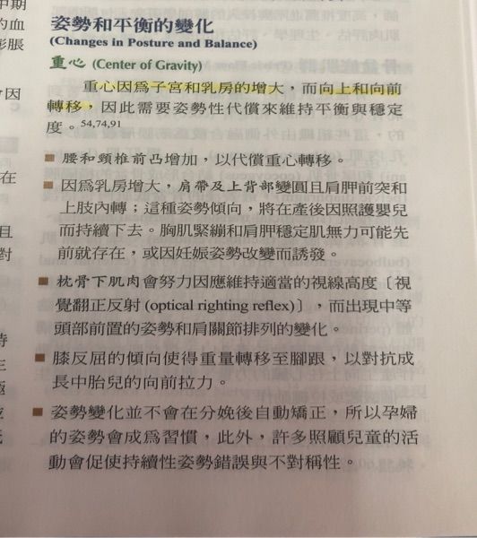 72.懷孕過程中,隨著婦女的子宮與乳房持續的增大,身體的重心將如何改變?