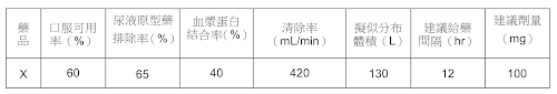 【題組】.有一女性病患,排灣族,身高160 cm,體重100公斤,年齡68歲,Scr : 2.6 mg/dL,BUN : 25 mg/dL,ALT : 22 U/L,AST : 20 U/L。今欲新添加一藥,文獻數據顯示其在正常人的藥動特性及一般建議療程如下表:
