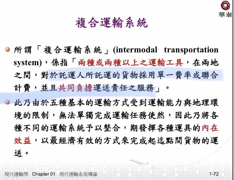 72. 下列何者為複合運輸對消費者所產生的主要利益或特點?